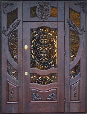 Поговорим об отделке. Вариантов декора дверей много. В большинстве случаев, для отделки элитных дверей используется массив натурального дерева или натуральный шпон с фрезеровкой. Цвет двери так же делается по желанию заказчика. Очень красиво и представительно выглядят двери с ковкой и стеклом.